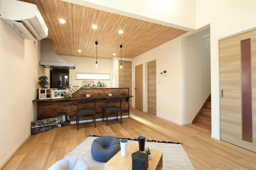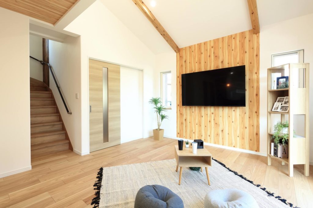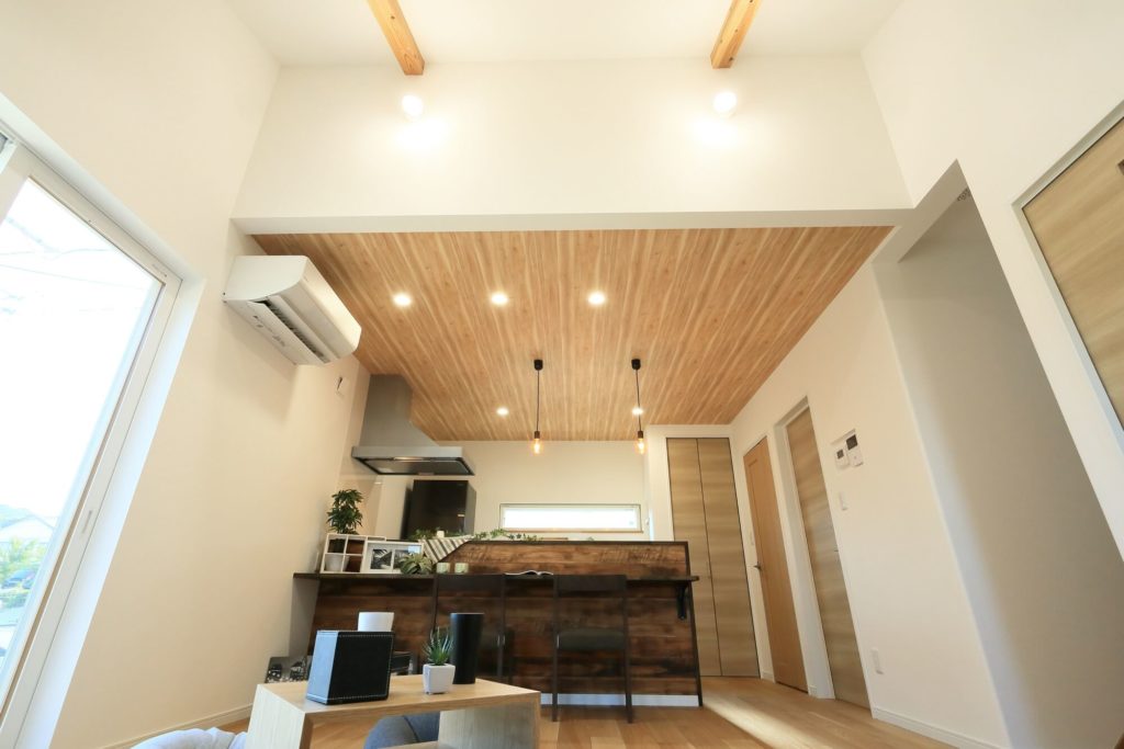 天井高で開放感あふれる木目を活かしたリビングルーム