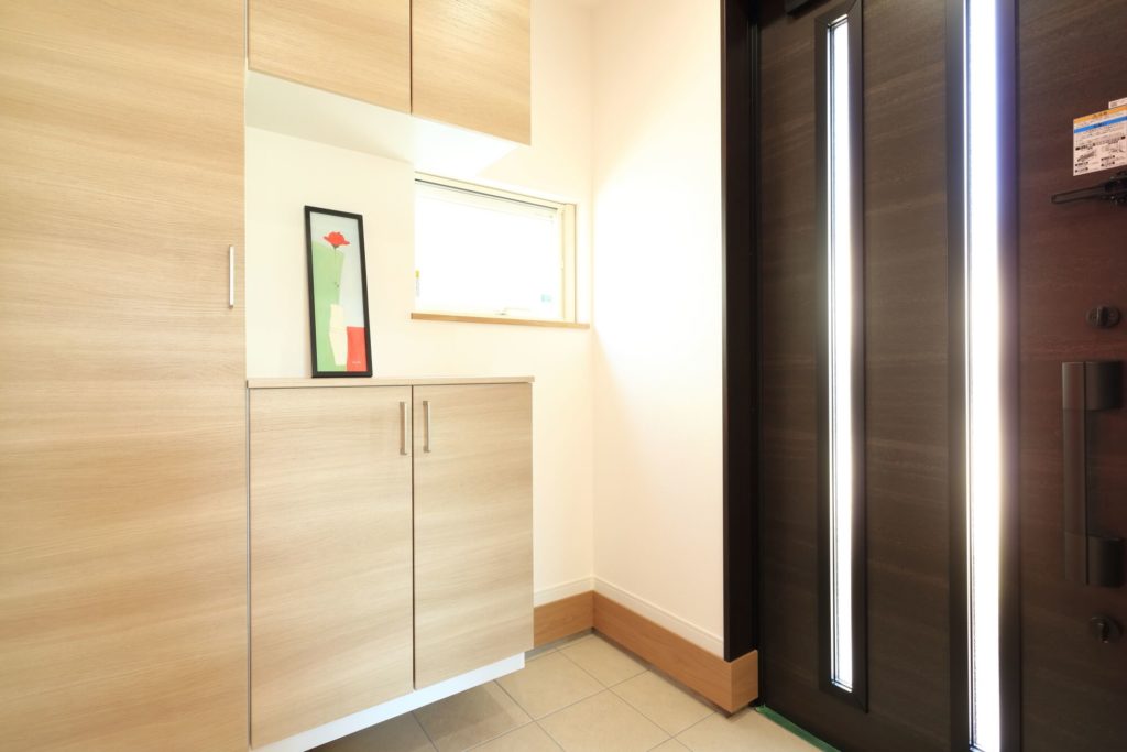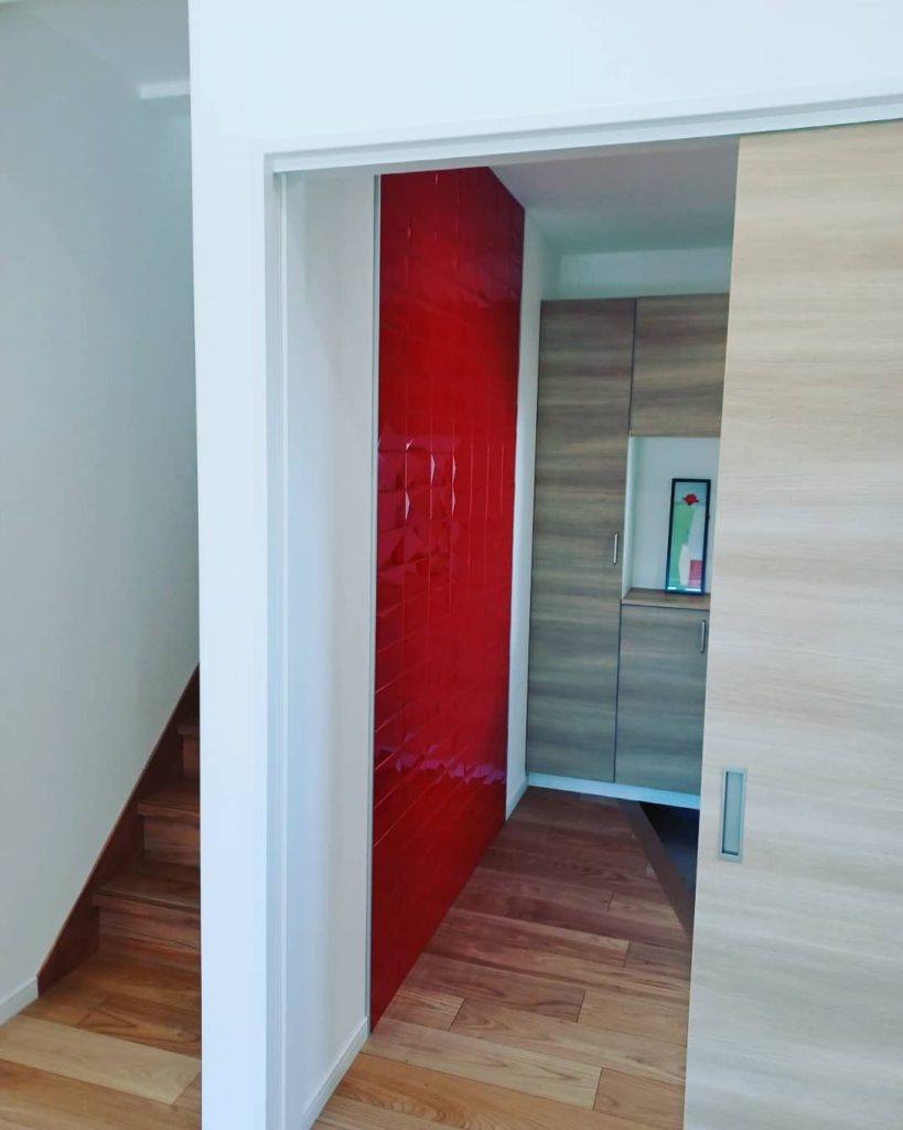 玄関に入ると、まず目に飛び込む真っ赤なイタリアンタイル!リビングは天井高のある吹き抜けが、明るく開放感たっぷりのリビングを作り出します。